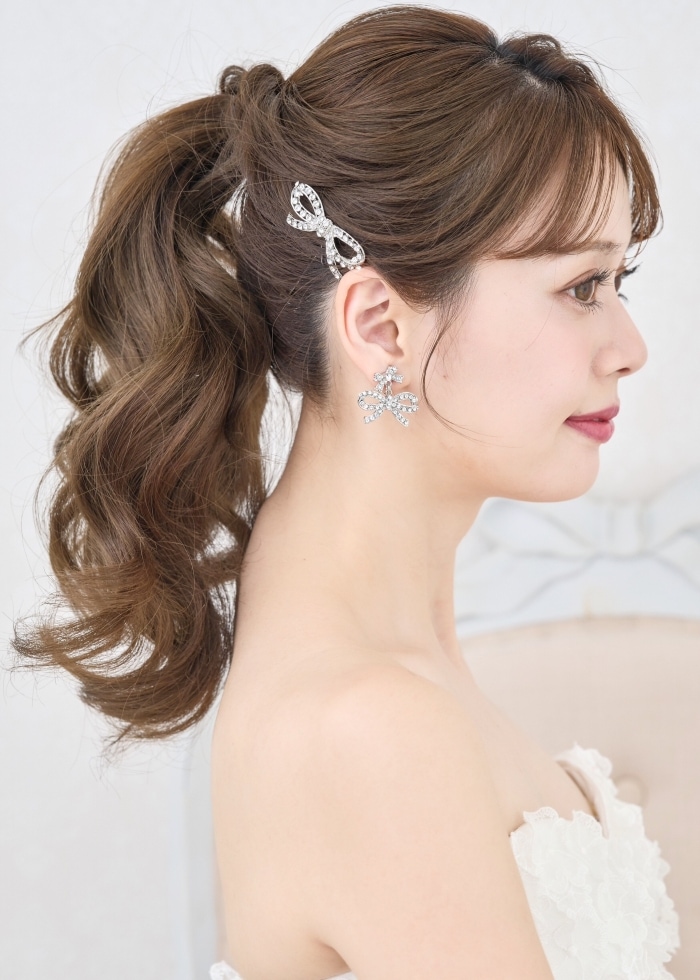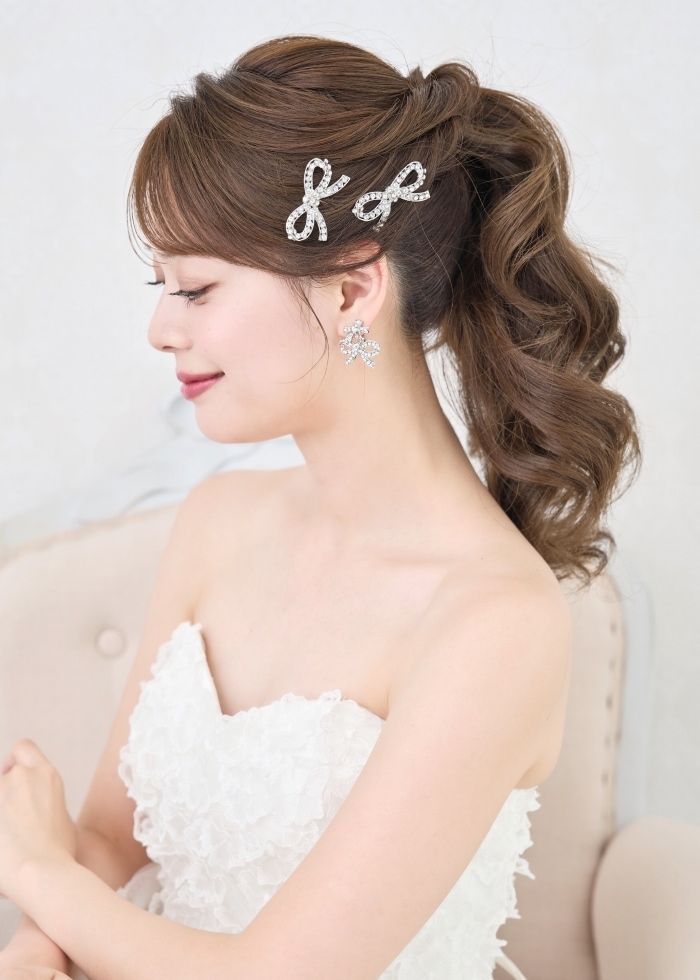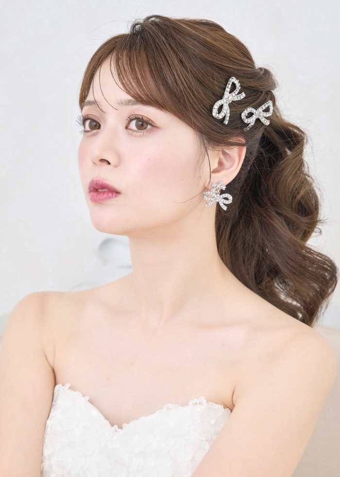 クリスタルガラスのビジューの輝きが美しいリボンモチーフアレンジピンセット。トレンドのリボンモチーフで旬顔のキュートな花嫁様に!ビジューを敷き詰めたデザインは光を集めてコーディネートのアクセントになります。