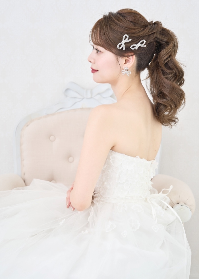 お好みのバランスで髪型に合わせて自由にアレンジできるのでお色直しや披露宴のアイテムとしておススメです。左右それぞれに2:1で分けることでどちらから見ても可愛くなります♡(イヤリングEK24別売り)