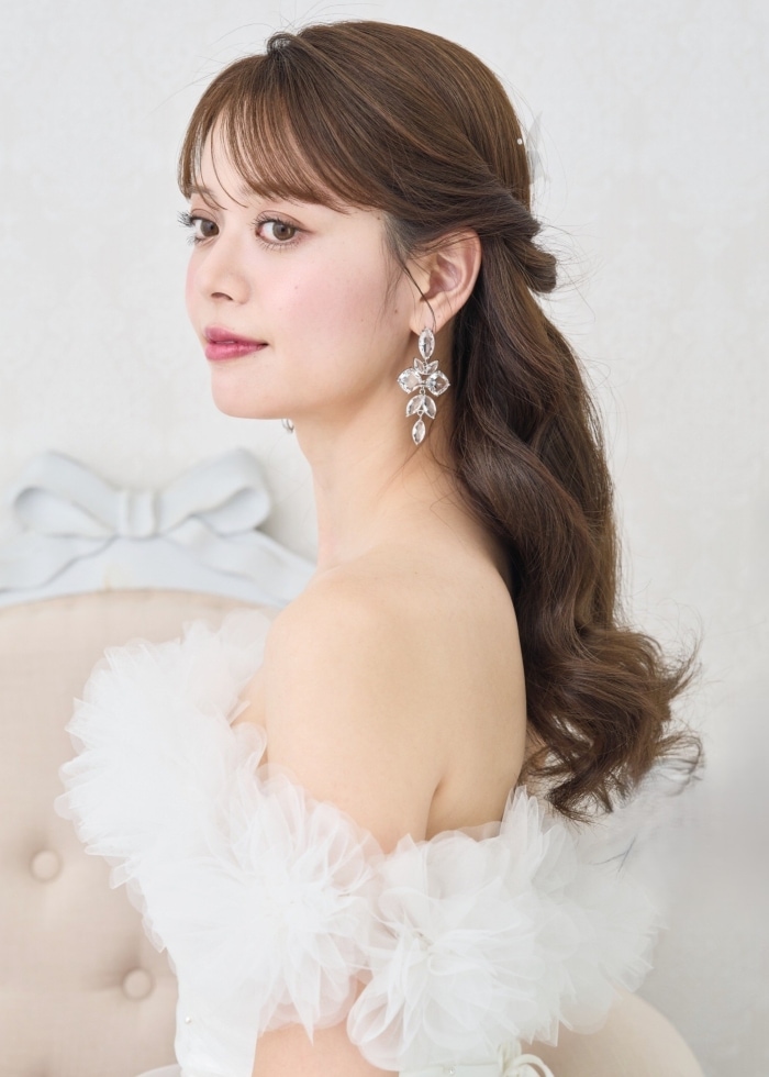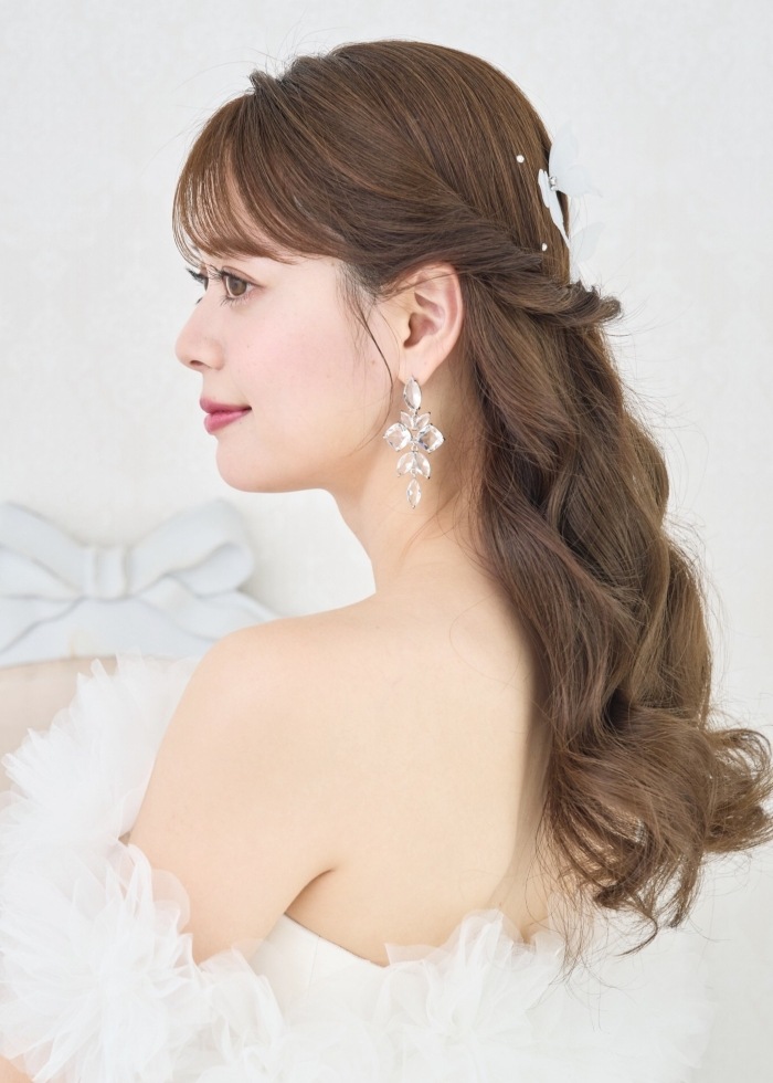 DESIGN 美しい輝きでお顔周りを明るく上品に見せてくれるウェディングピアス。光を集める大粒ビジューと特徴的なデザインがコーディネートのアクセントになり、遠くから見ても存在感抜群です。 透明度の高いガラスビジューは高級感のあるリッチな雰囲気。ワンランク上の華やかな披露宴やお色直しのアイテムにぴったりです。 (ヘッドドレス別売り)
