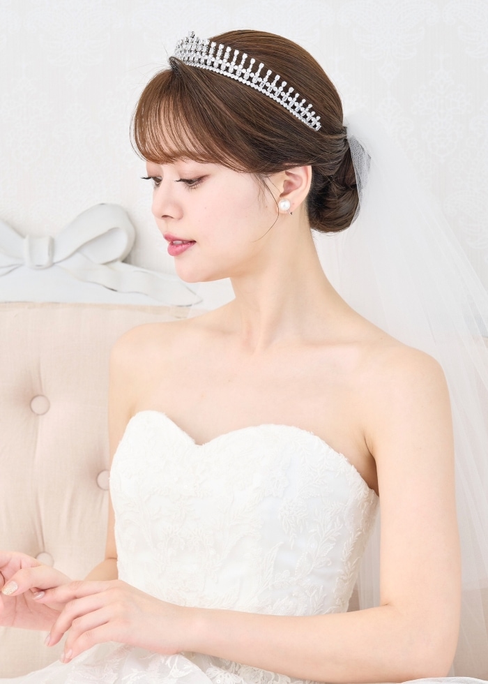 横幅広めティアラ JT24 DESIGN ロイヤルクラウンをイメージさせるようなノーブルなデザインのティアラ。珍しいキューブカットのジルコニアが整然と並んだクラス感のあるシルエットは、ホテルウェディングや海外前撮りなどのハイランクな雰囲気にぴったり!圧倒的な輝きを放つグレードの高い3A級ジルコニアだから叶う、高貴な美しさを詰め込んだ特別なティアラです♡べールとイヤリングME259別売り QUALITY 職人が一点一点丁寧な手作業で仕上げる高品質なアイテム。最高品位の3A級ジルコニアを贅沢に使用した高級感のあるシリーズです。オリジナルロゴ入りケースに入れて大切にお届けします♡