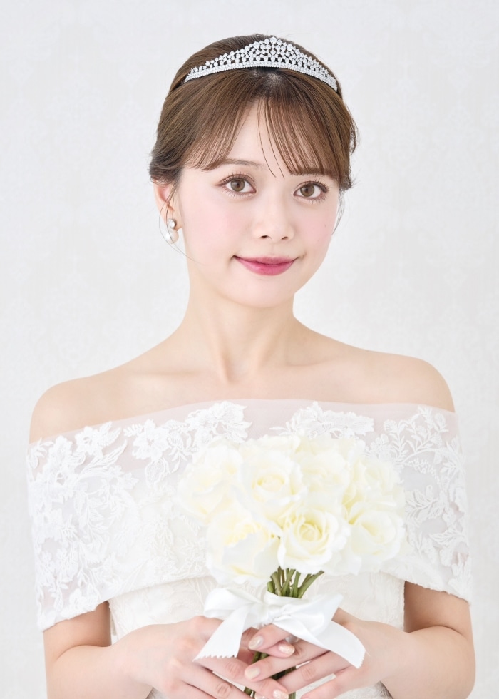 洗練された正統派シンプルエレガンスなティアラです。王道の低めのティアラで、全体の高さを抑えつつも緩やかな山型が上品な佇まいを叶えてくれます。ホテルウェディングなど格式高い場所でもおすすめ。サイドから見た曲線が美しく、スタイリッシュでモダンな雰囲気にも合います。