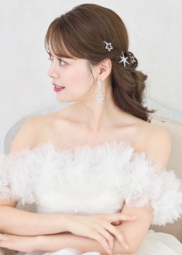 美しい輝きのスターモチーフヘアピン5本セット。大小デザイン違いの星がコーデのポイントになります。敷き詰められたビジューとクリアガラスがキラキラと輝き存在感があります。