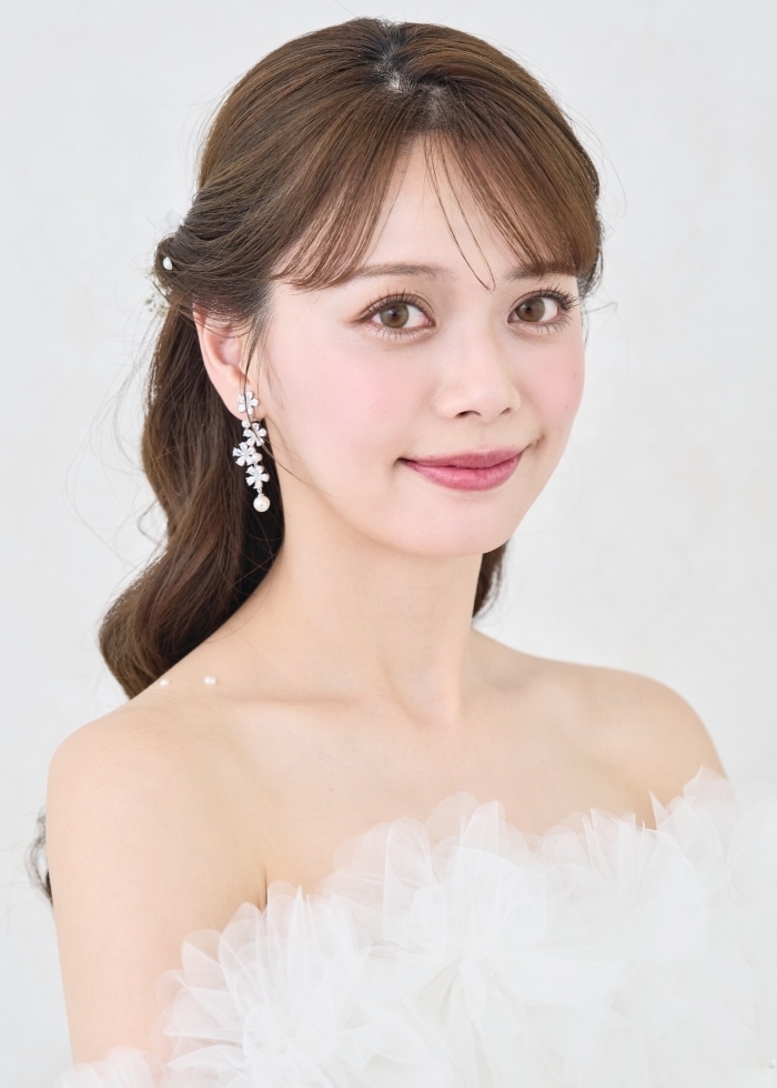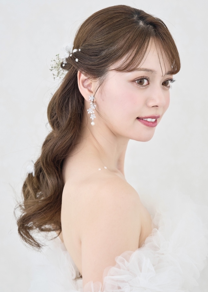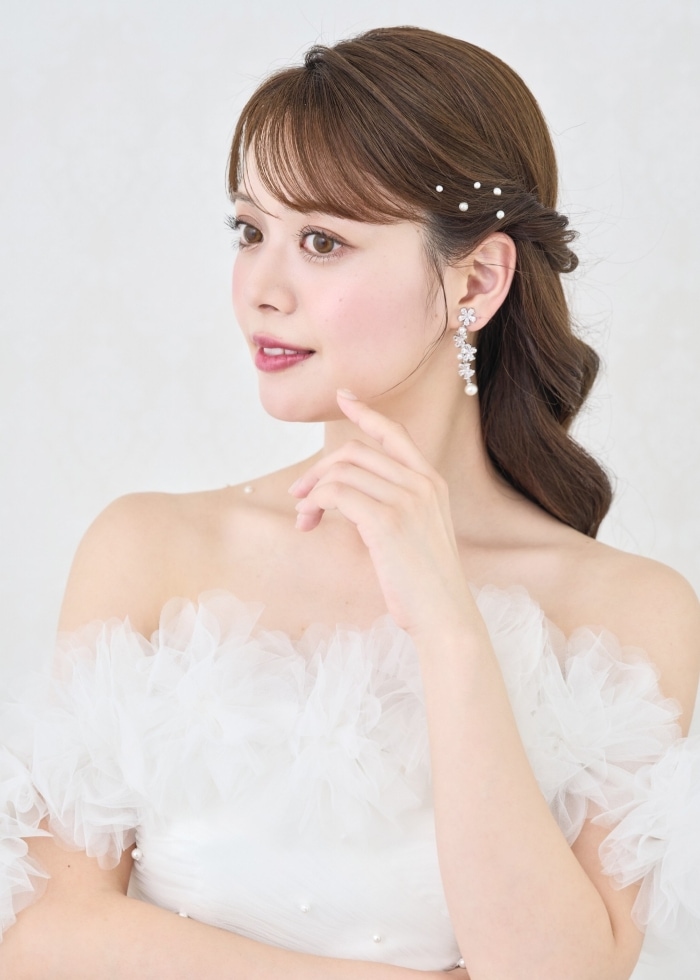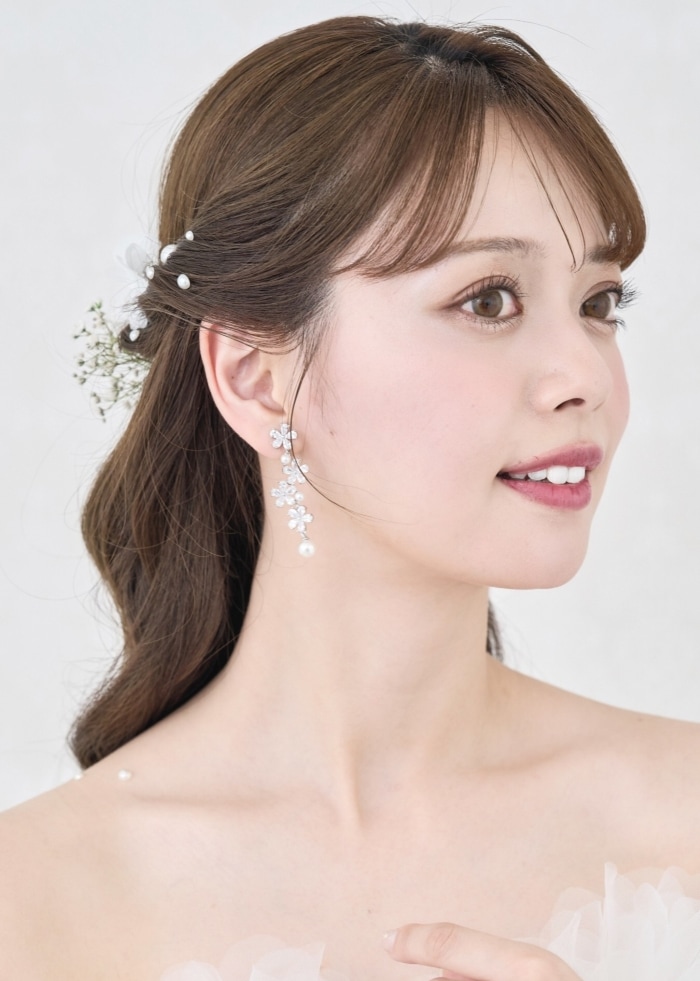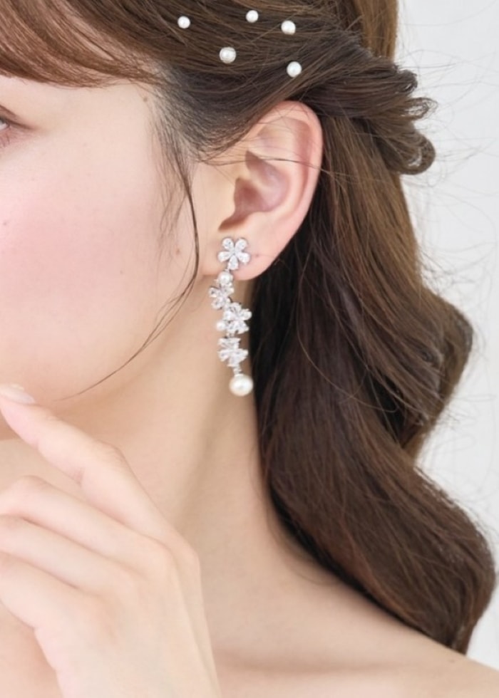 DESIGN トレンド感のある大人気のフラワーモチーフのイヤリング/ピアス。可憐な輝きのジルコニアと可愛らしいパールの組み合わせで、高級感のある雰囲気に、細身のデザインですが、 バランスの取れた大きさと4つに連なったお花で、揺れ感と華やかさもあり挙式や披露宴、フォトウェディングにもぴったりのアイテムです。(ヘッドドレスMA295別売り)